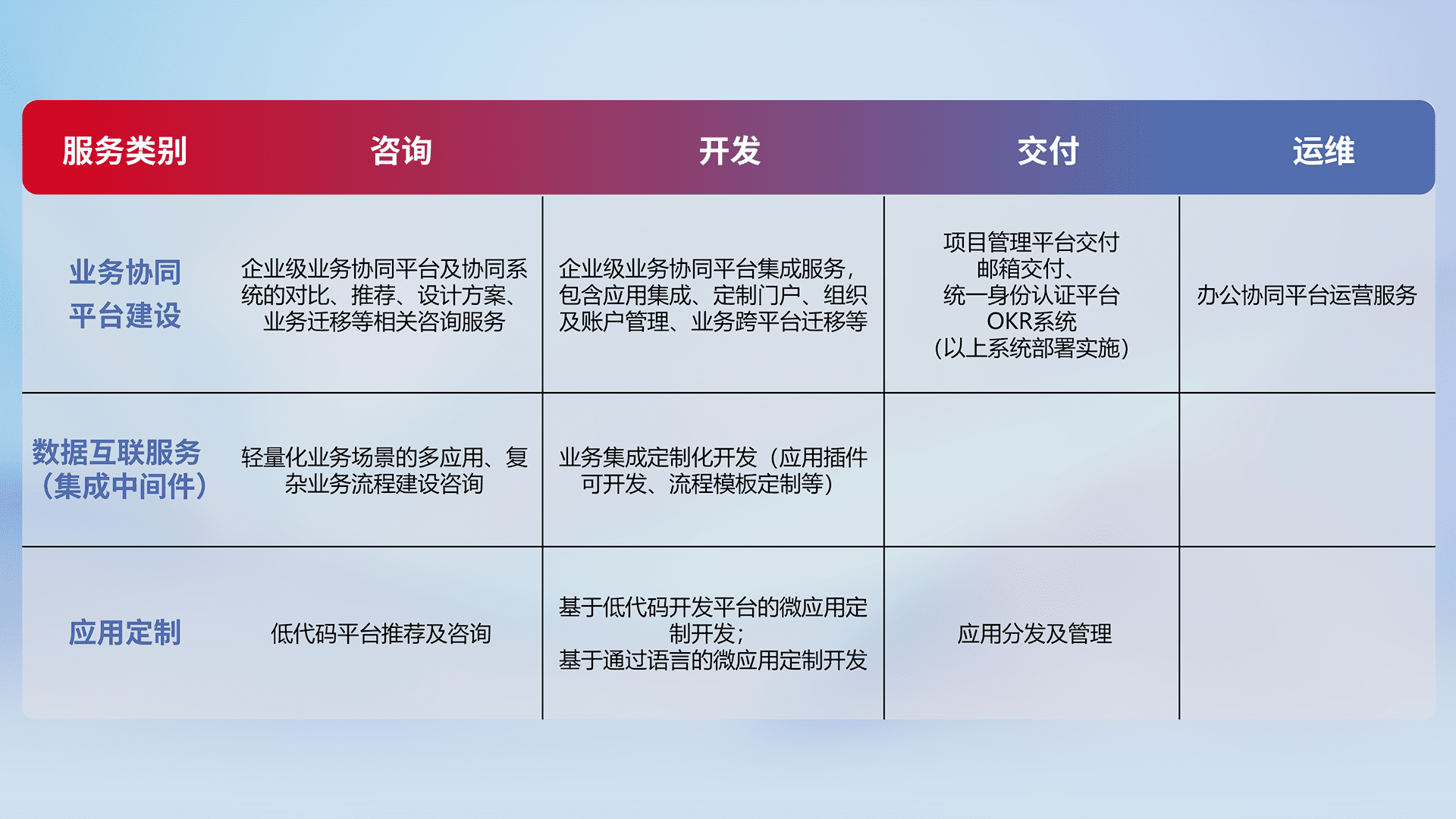 针对钉钉、、企微、、IDaas等平台级产品提供产品的规划、、方案、、交付、、、定制化开发等服务,,,,实现如统一协同办公、、、、智能客户服务、、混合会议管理、、智能数据查询、、、等业务场景,,实现数字化转型。。