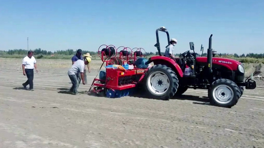 在岳普湖县巴依阿瓦提乡柳树王村的小麦种植现场,,,,装有北斗终端的大马力拖拉机正按照预先设定的播种线路精量播种小麦。。。。整地、、、施肥、、、播种,,,整个种植过程紧张有序,,,,现场一派繁忙景象...