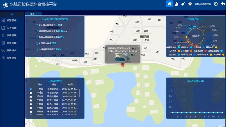 基于北斗高精服务的巡逻无人机自主完成起飞、、、、图像采集、、、、降落、、、充电等动作,,采集视频数据回传给水域巡检数据综合管控平台,,,,经过视觉AI分析,,,,对千岛湖复杂多样的线索进行自动分类,,,同步给“数字第一湖”平台...