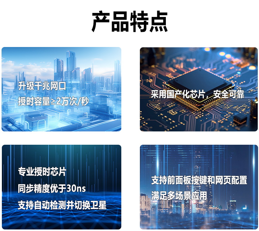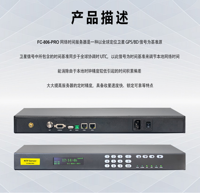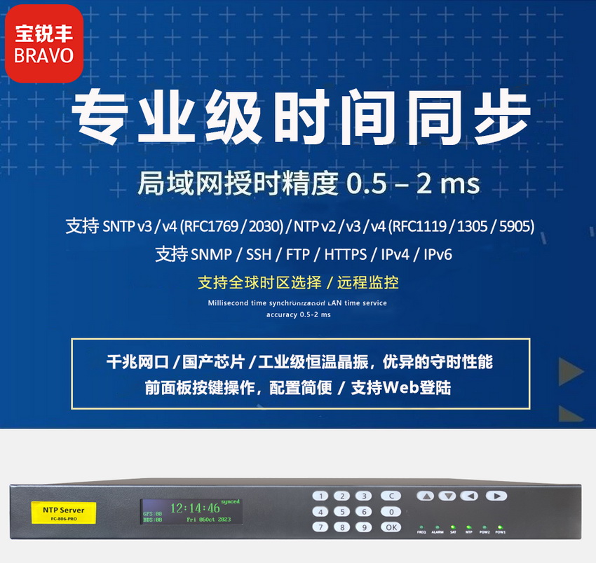 近日,,,,我司推出一款千兆网口 NTP 网络时间服务器 FC-806-PRO ,,,采用国产专业型授时芯片和处理器,,,,安全可靠,,,,同步精度优于30ns。。。。全千兆网口,,均为物理隔离,,,授时容量≥20000次/秒。。。。支持SNTP和NTP协议,,支持IPv4/ IPv6、、、、支持SSH/FTP/HTTPS/SNMP协议,,满足多场景应用。。前面板按键配置设备IP地址,,,,操作简便。。。
